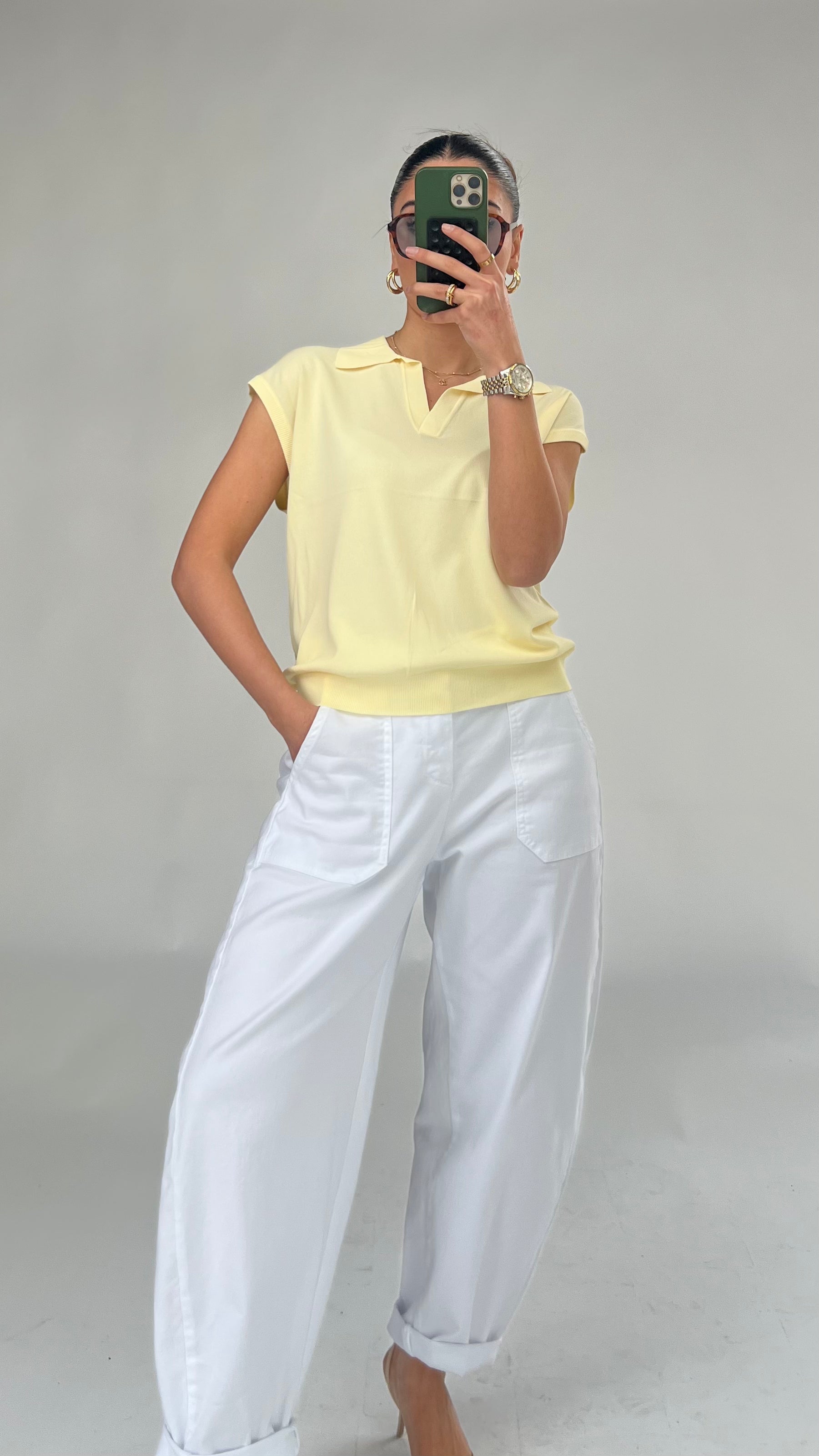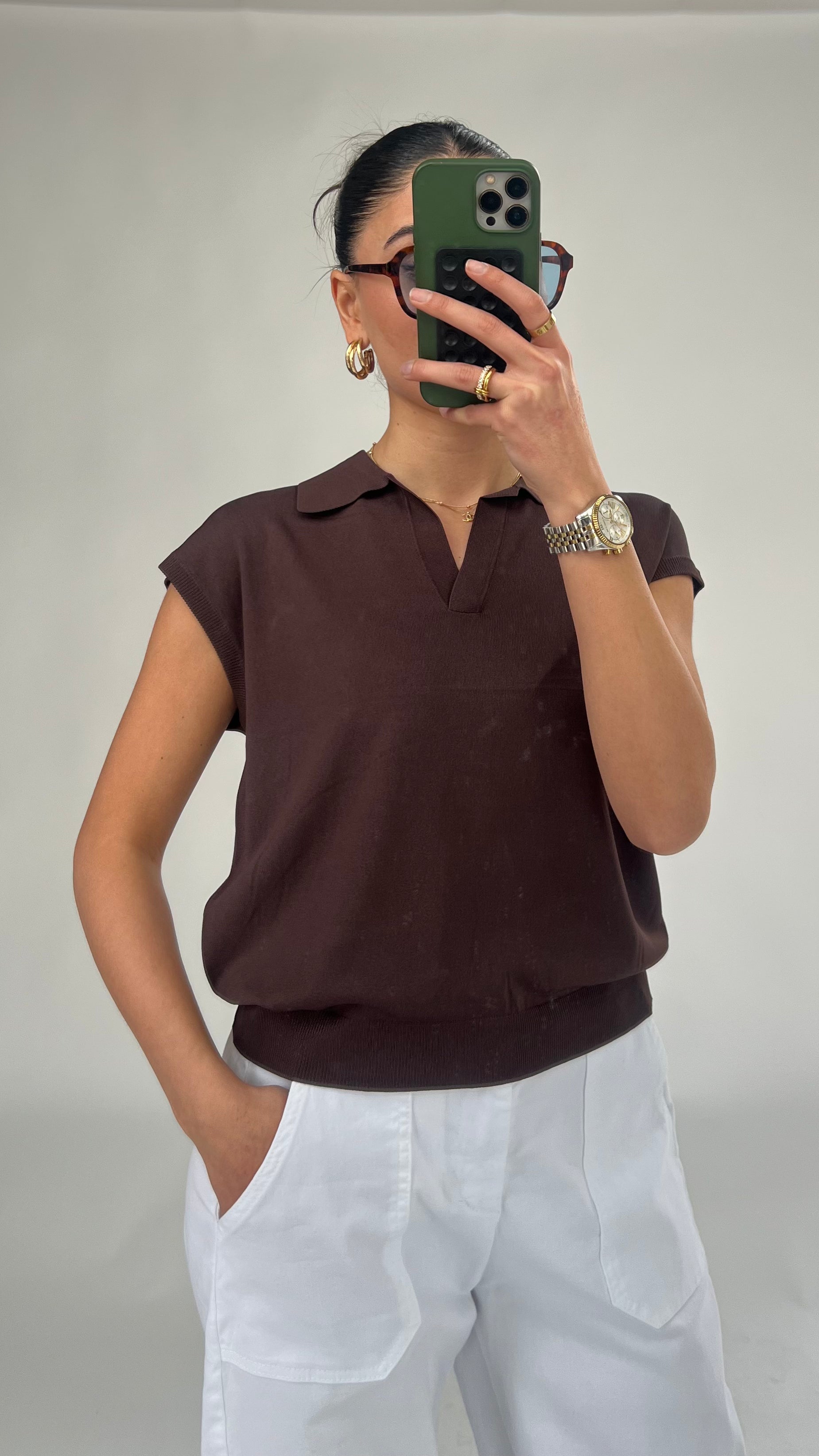 Dieses stilvolle Strick-Top überzeugt mit seinem modernen, schlichten Design und einem eleganten Polokragen. Der feine V-Ausschnitt sorgt für eine feminine Note, während der weiche, fließende Stoff angenehm auf der Haut liegt. Perfekt kombinierbar – ob lässig zur Jeans oder schick zur Stoffhose.