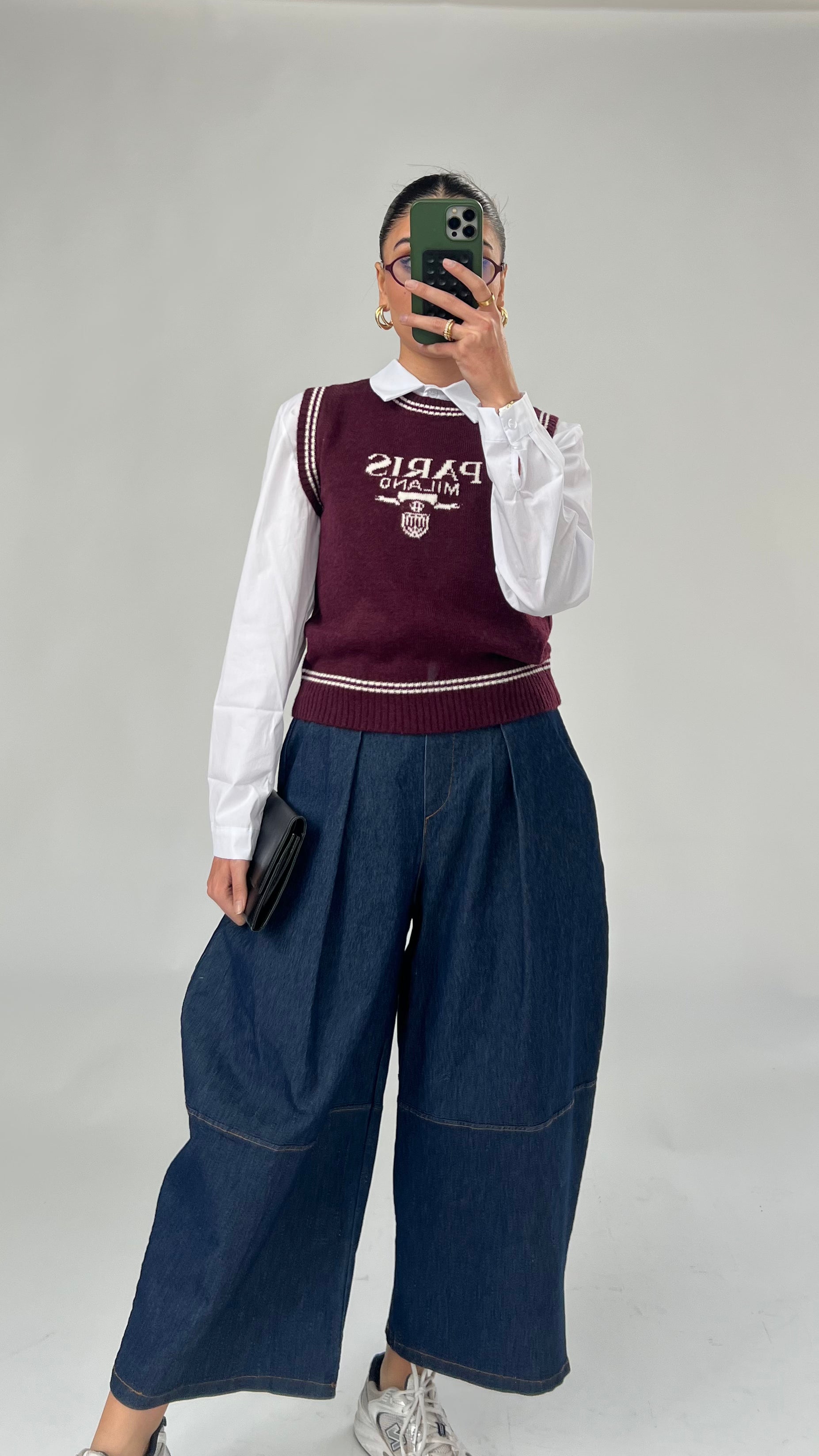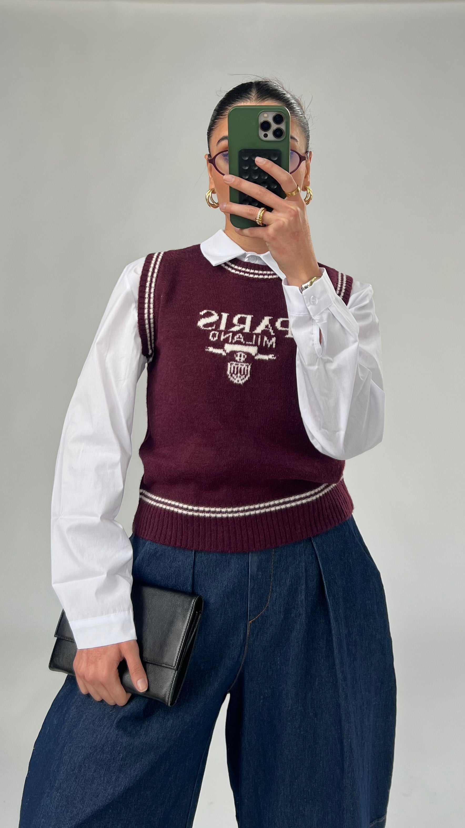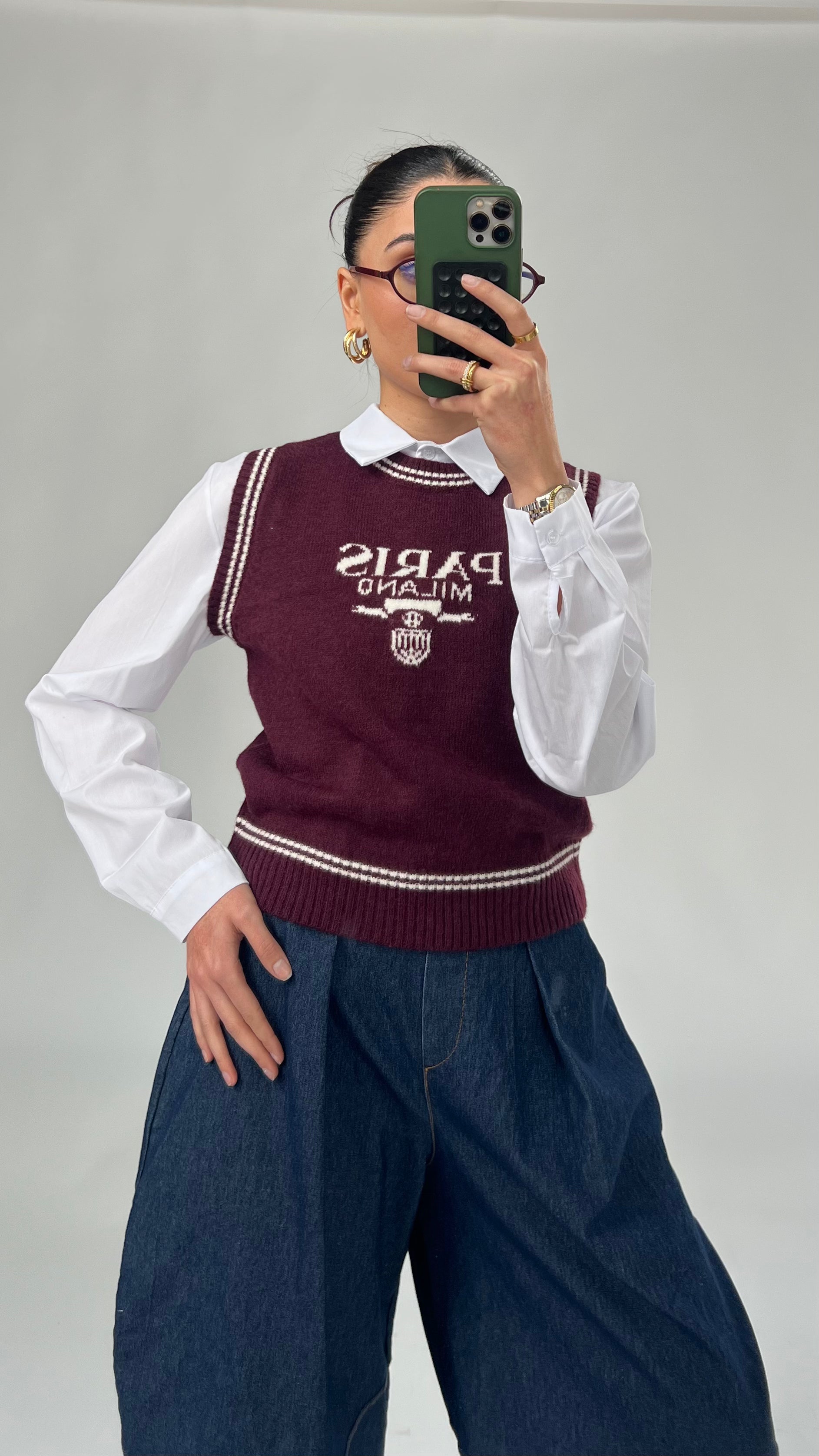 Dieses trendige Strick-Top in edlem Bordeaux ist ein echter Hingucker. Der eingestrickte „PARIS MILANO“-Schriftzug auf der Vorderseite verleiht dem Modell einen modischen, urbanen Touch. Die kontrastierenden Streifen an Ausschnitt, Ärmeln und Saum unterstreichen den sportlich-eleganten Look und machen das Top vielseitig kombinierbar – ob lässig zur Jeans oder schichtet mit Blazer.