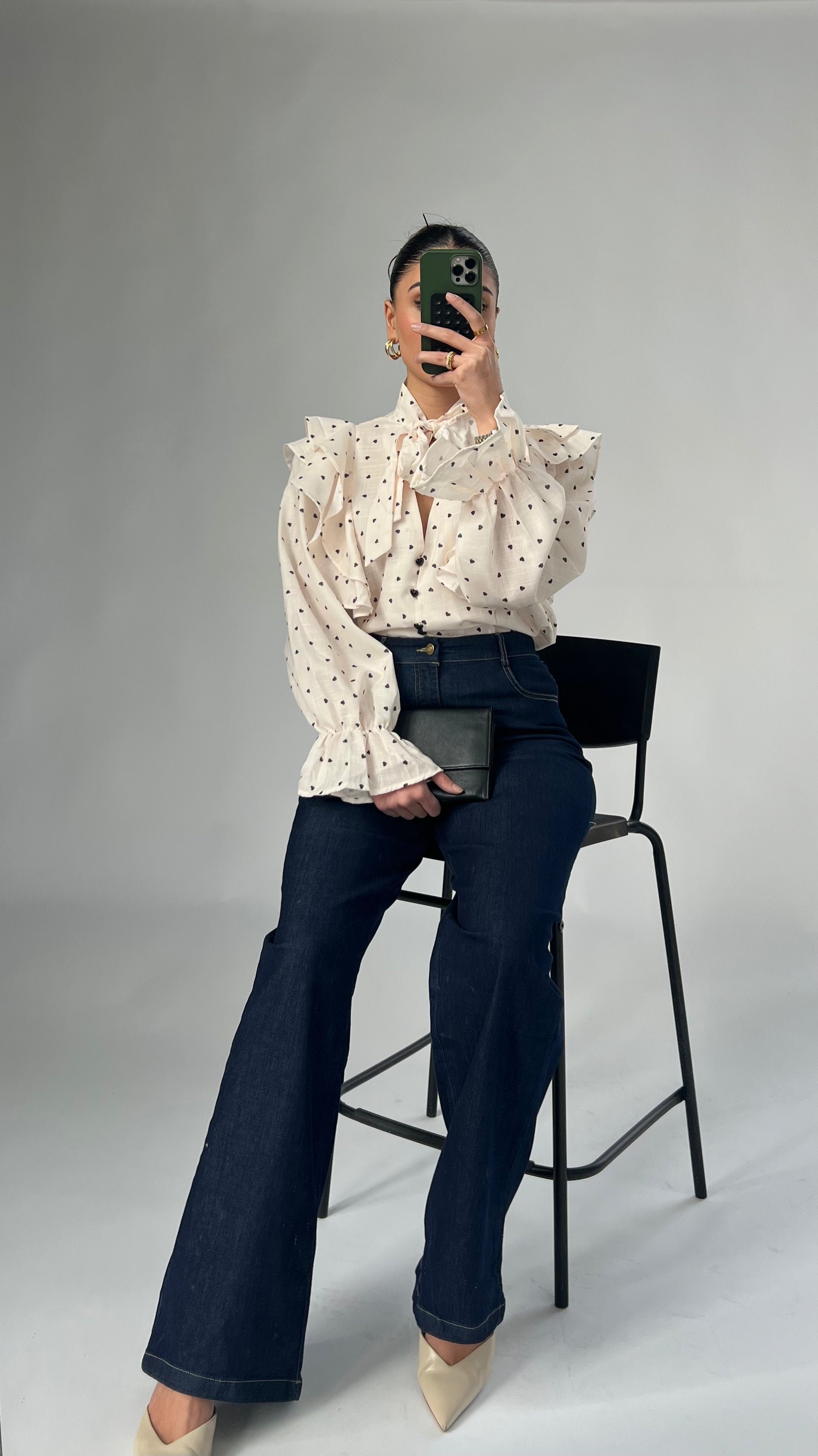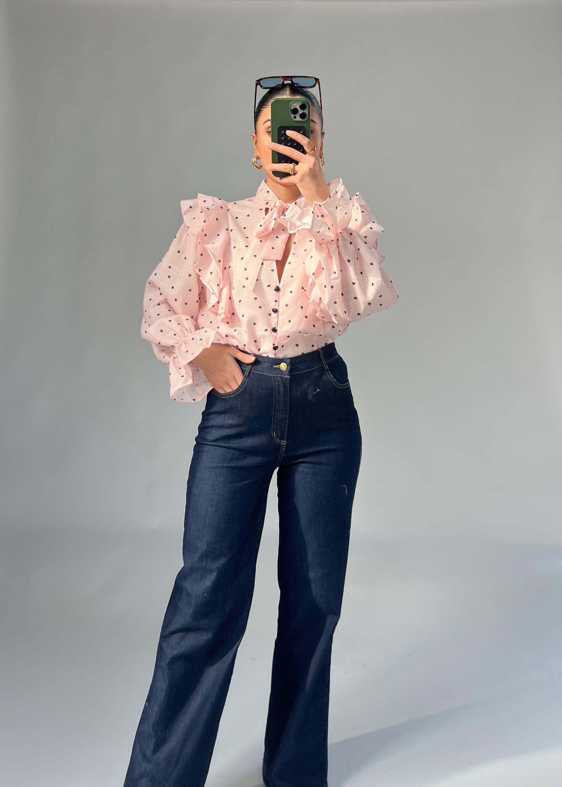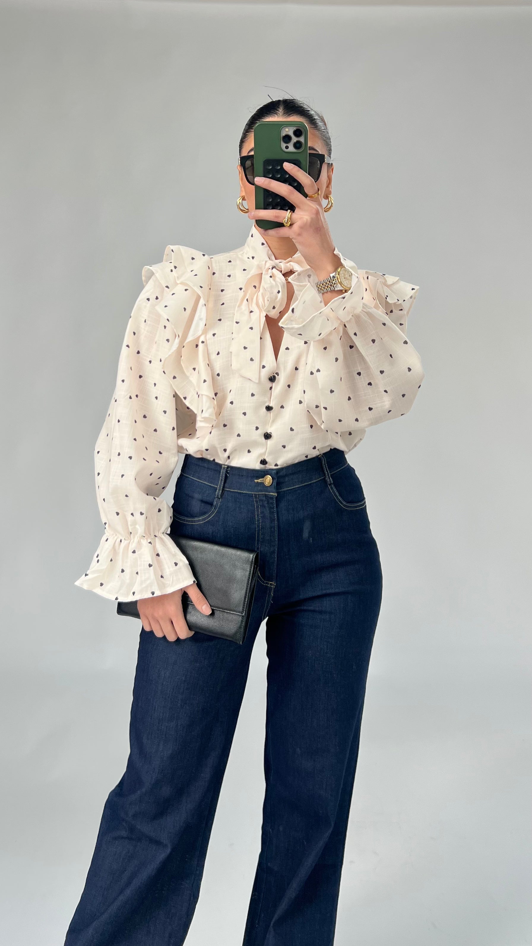 Diese superschöne Bluse ist ein echter Hingucker und perfekt für alle, die das Besondere lieben. Das zarte Herzmuster verleiht ihr einen romantischen Touch, während die auffälligen Herzknöpfe auf der Vorderseite das Design liebevoll abrunden.