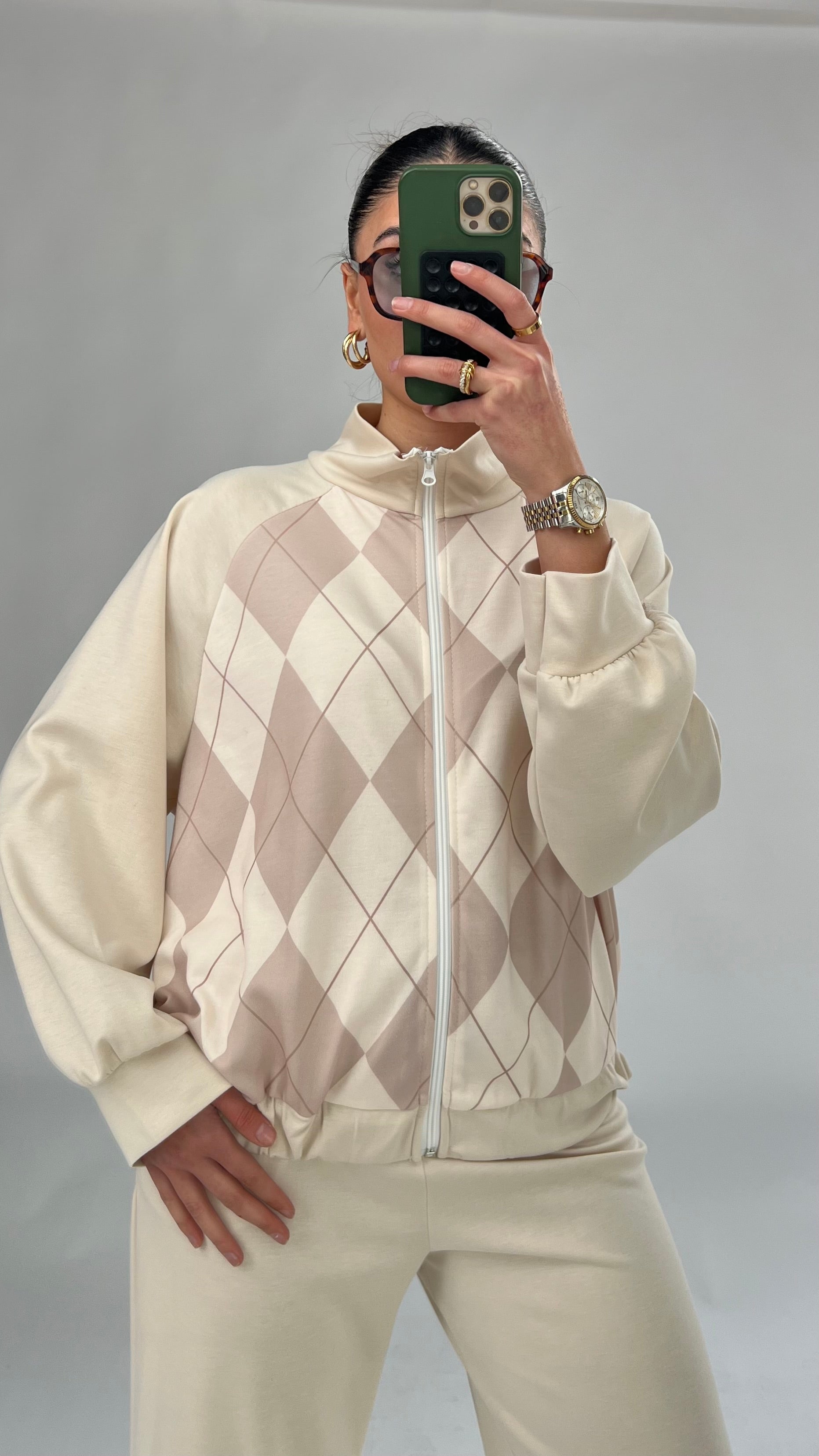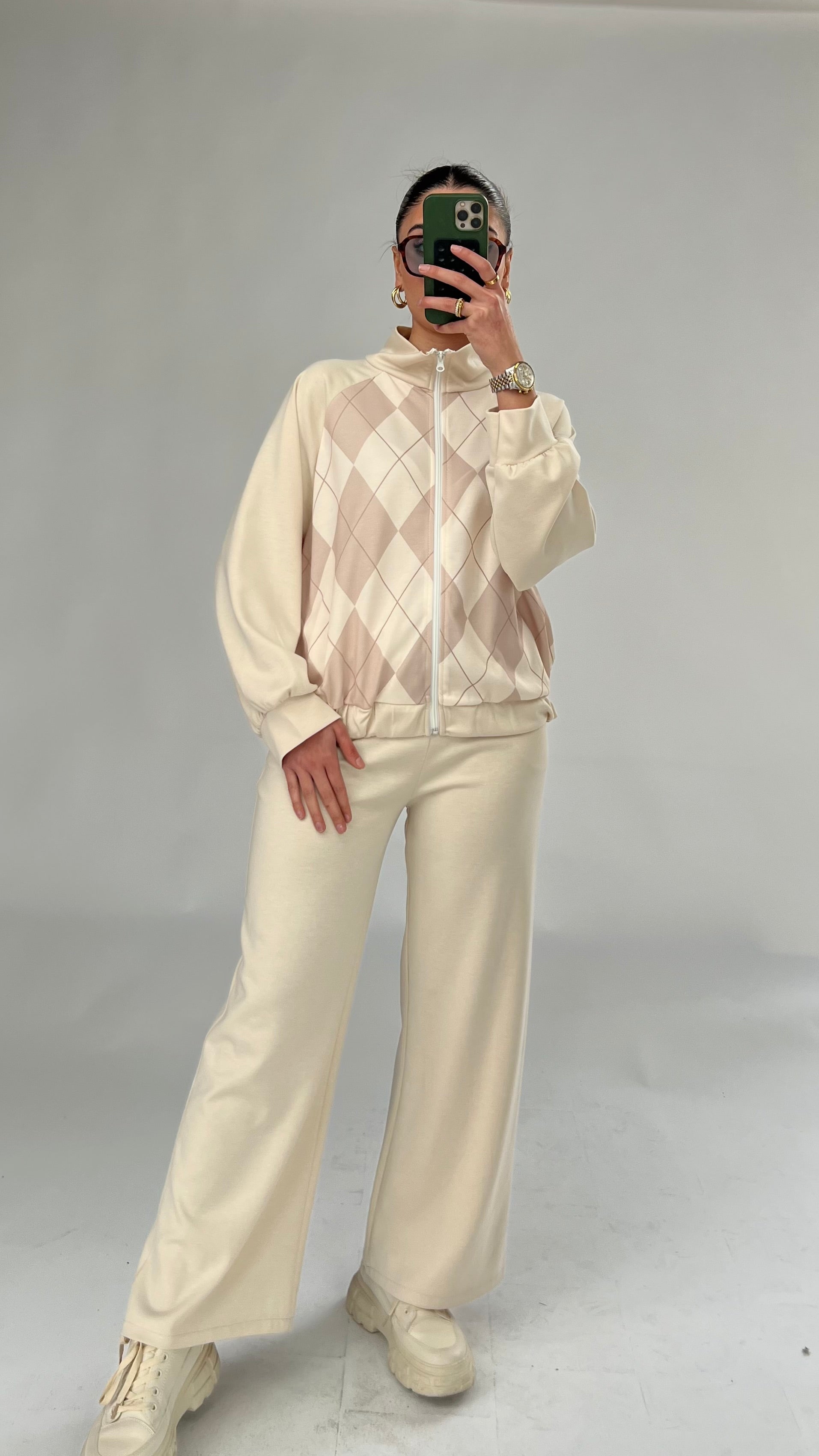 Dieses wunderschöne Set besteht aus einer locker geschnittenen Jacke/Weste mit Reißverschluss und passender Hose. Der Schnitt ist lässig und bequem – perfekt für einen entspannten, aber dennoch stilvollen Look.